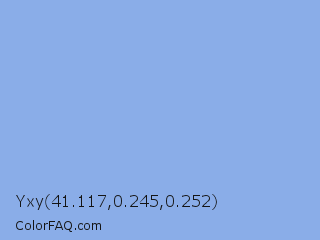 Yxy 41.117,0.245,0.252 Color is a light blue color and the nearest color is Light Cobalt Blue #88ace0. Hex code #8aade8 and RGB value is rgb(138,173,232). In RGB color space, this color is composed of 54% red, 68% green, 91% blue, In CMYK color space, this color is composed of 41% cyan, 25% magenta, 0% yellow , 9% black , In HSL color space, this color has a hue angle of 218° , 67% saturation and 73% lightness.