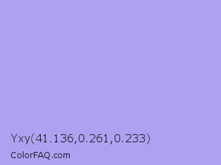 Yxy 41.136,0.261,0.233 Color is a light indigo color and the nearest color is Biloba Flower #b2a1ea. Hex code #ada2f2 and RGB value is rgb(173,162,242). In RGB color space, this color is composed of 68% red, 64% green, 95% blue, In CMYK color space, this color is composed of 29% cyan, 33% magenta, 0% yellow , 5% black , In HSL color space, this color has a hue angle of 248° , 75% saturation and 79% lightness.