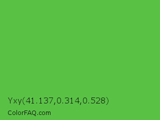 Yxy 41.137,0.314,0.528 Color is a normal green color and the nearest color is Apple #4fa83d. Hex code #59c245 and RGB value is rgb(89,194,69). In RGB color space, this color is composed of 35% red, 76% green, 27% blue, In CMYK color space, this color is composed of 54% cyan, 0% magenta, 64% yellow , 24% black , In HSL color space, this color has a hue angle of 110° , 51% saturation and 52% lightness.