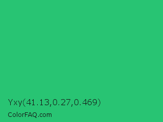 Yxy 41.13,0.27,0.469 Color is a normal green color and the nearest color is UFO Green #3cd070. Hex code #28c473 and RGB value is rgb(40,196,115). In RGB color space, this color is composed of 16% red, 77% green, 45% blue, In CMYK color space, this color is composed of 80% cyan, 0% magenta, 41% yellow , 23% black , In HSL color space, this color has a hue angle of 149° , 66% saturation and 46% lightness.