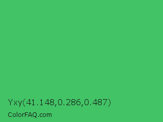 Yxy 41.148,0.286,0.487 Color is a normal green color and the nearest color is UFO Green #3cd070. Hex code #42c366 and RGB value is rgb(66,195,102). In RGB color space, this color is composed of 26% red, 76% green, 40% blue, In CMYK color space, this color is composed of 66% cyan, 0% magenta, 48% yellow , 24% black , In HSL color space, this color has a hue angle of 137° , 52% saturation and 51% lightness.