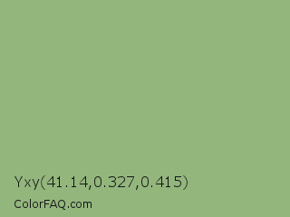 Yxy 41.14,0.327,0.415 Color is a normal green color and the nearest color is Olivine #9ab973. Hex code #93b67d and RGB value is rgb(147,182,125). In RGB color space, this color is composed of 58% red, 71% green, 49% blue, In CMYK color space, this color is composed of 19% cyan, 0% magenta, 31% yellow , 29% black , In HSL color space, this color has a hue angle of 97° , 28% saturation and 60% lightness.