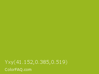 Yxy 41.152,0.385,0.519 Color is a normal lime color and the nearest color is Citron #9fa91f. Hex code #99b81f and RGB value is rgb(153,184,31). In RGB color space, this color is composed of 60% red, 72% green, 12% blue, In CMYK color space, this color is composed of 17% cyan, 0% magenta, 83% yellow , 28% black , In HSL color space, this color has a hue angle of 72° , 71% saturation and 42% lightness.