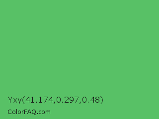 Yxy 41.174,0.297,0.48 Color is a normal green color and the nearest color is Fern #63b76c. Hex code #58c166 and RGB value is rgb(88,193,102). In RGB color space, this color is composed of 35% red, 76% green, 40% blue, In CMYK color space, this color is composed of 54% cyan, 0% magenta, 47% yellow , 24% black , In HSL color space, this color has a hue angle of 128° , 46% saturation and 55% lightness.