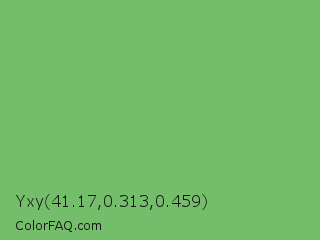 Yxy 41.17,0.313,0.459 Color is a normal green color and the nearest color is Mantis #74c365. Hex code #74bd6b and RGB value is rgb(116,189,107). In RGB color space, this color is composed of 45% red, 74% green, 42% blue, In CMYK color space, this color is composed of 39% cyan, 0% magenta, 43% yellow , 26% black , In HSL color space, this color has a hue angle of 113° , 38% saturation and 58% lightness.