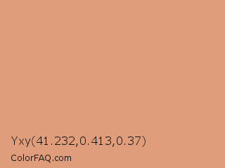 Yxy 41.232,0.413,0.37 Color is a light orange color and the nearest color is Tumbleweed #dea681. Hex code #df9d7b and RGB value is rgb(223,157,123). In RGB color space, this color is composed of 87% red, 62% green, 48% blue, In CMYK color space, this color is composed of 0% cyan, 30% magenta, 45% yellow , 13% black , In HSL color space, this color has a hue angle of 20° , 61% saturation and 68% lightness.