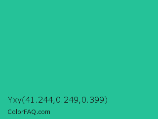 Yxy 41.244,0.249,0.399 Color is a normal cyan color and the nearest color is Mountain Meadow #30ba8f. Hex code #25c298 and RGB value is rgb(37,194,152). In RGB color space, this color is composed of 15% red, 76% green, 60% blue, In CMYK color space, this color is composed of 81% cyan, 0% magenta, 22% yellow , 24% black , In HSL color space, this color has a hue angle of 164° , 68% saturation and 45% lightness.