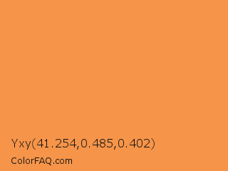 Yxy 41.254,0.485,0.402 Color is a light orange color and the nearest color is Neon Carrot #ffa343. Hex code #f69449 and RGB value is rgb(246,148,73). In RGB color space, this color is composed of 96% red, 58% green, 29% blue, In CMYK color space, this color is composed of 0% cyan, 40% magenta, 70% yellow , 4% black , In HSL color space, this color has a hue angle of 26° , 91% saturation and 63% lightness.
