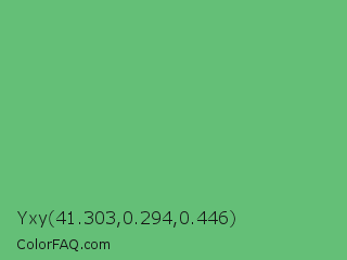 Yxy 41.303,0.294,0.446 Color is a normal green color and the nearest color is Iguana Green #71bc78. Hex code #64bf77 and RGB value is rgb(100,191,119). In RGB color space, this color is composed of 39% red, 75% green, 47% blue, In CMYK color space, this color is composed of 48% cyan, 0% magenta, 38% yellow , 25% black , In HSL color space, this color has a hue angle of 133° , 42% saturation and 57% lightness.