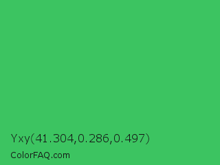 Yxy 41.304,0.286,0.497 Color is a normal green color and the nearest color is UFO Green #3cd070. Hex code #3cc461 and RGB value is rgb(60,196,97). In RGB color space, this color is composed of 24% red, 77% green, 38% blue, In CMYK color space, this color is composed of 69% cyan, 0% magenta, 51% yellow , 23% black , In HSL color space, this color has a hue angle of 136° , 54% saturation and 50% lightness.
