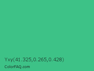 Yxy 41.325,0.265,0.428 Color is a normal green color and the nearest color is Mint #3eb489. Hex code #3dc287 and RGB value is rgb(61,194,135). In RGB color space, this color is composed of 24% red, 76% green, 53% blue, In CMYK color space, this color is composed of 69% cyan, 0% magenta, 30% yellow , 24% black , In HSL color space, this color has a hue angle of 153° , 52% saturation and 50% lightness.