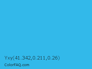 Yxy 41.342,0.211,0.26 Color is a normal blue color and the nearest color is Picton Blue #45b1e8. Hex code #32b9ea and RGB value is rgb(50,185,234). In RGB color space, this color is composed of 20% red, 73% green, 92% blue, In CMYK color space, this color is composed of 79% cyan, 21% magenta, 0% yellow , 8% black , In HSL color space, this color has a hue angle of 196° , 81% saturation and 56% lightness.