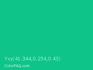 Yxy 41.344,0.254,0.43 Color is a normal green color and the nearest color is Mountain Meadow Crayola #1ab385. Hex code #0ec489 and RGB value is rgb(14,196,137). In RGB color space, this color is composed of 5% red, 77% green, 54% blue, In CMYK color space, this color is composed of 93% cyan, 0% magenta, 30% yellow , 23% black , In HSL color space, this color has a hue angle of 161° , 87% saturation and 41% lightness.