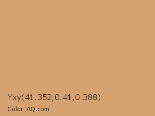 Yxy 41.352,0.41,0.388 Color is a light orange color and the nearest color is Whiskey #d59a6f. Hex code #d6a272 and RGB value is rgb(214,162,114). In RGB color space, this color is composed of 84% red, 64% green, 45% blue, In CMYK color space, this color is composed of 0% cyan, 24% magenta, 47% yellow , 16% black , In HSL color space, this color has a hue angle of 29° , 55% saturation and 64% lightness.