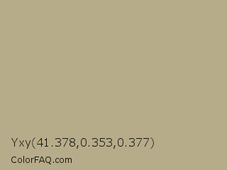 Yxy 41.378,0.353,0.377 Color is a light yellow color and the nearest color is Heathered Gray #b6b095. Hex code #b7ac89 and RGB value is rgb(183,172,137). In RGB color space, this color is composed of 72% red, 67% green, 54% blue, In CMYK color space, this color is composed of 0% cyan, 6% magenta, 25% yellow , 28% black , In HSL color space, this color has a hue angle of 46° , 24% saturation and 63% lightness.