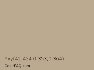Yxy 41.454,0.353,0.364 Color is a light orange color and the nearest color is Indian Khaki #c3b091. Hex code #bcaa90 and RGB value is rgb(188,170,144). In RGB color space, this color is composed of 74% red, 67% green, 56% blue, In CMYK color space, this color is composed of 0% cyan, 10% magenta, 23% yellow , 26% black , In HSL color space, this color has a hue angle of 35° , 25% saturation and 65% lightness.