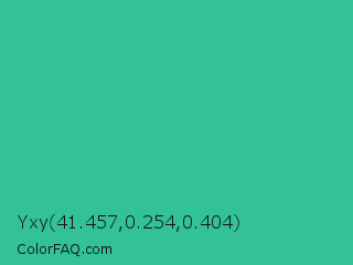 Yxy 41.457,0.254,0.404 Color is a normal green color and the nearest color is Mountain Meadow #30ba8f. Hex code #32c295 and RGB value is rgb(50,194,149). In RGB color space, this color is composed of 20% red, 76% green, 58% blue, In CMYK color space, this color is composed of 74% cyan, 0% magenta, 23% yellow , 24% black , In HSL color space, this color has a hue angle of 161° , 59% saturation and 48% lightness.