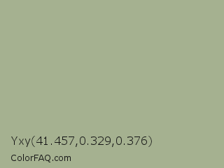 Yxy 41.457,0.329,0.376 Color is a light green color and the nearest color is Locust #a8af8e. Hex code #a5b190 and RGB value is rgb(165,177,144). In RGB color space, this color is composed of 65% red, 69% green, 56% blue, In CMYK color space, this color is composed of 7% cyan, 0% magenta, 19% yellow , 31% black , In HSL color space, this color has a hue angle of 82° , 17% saturation and 63% lightness.