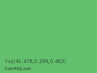 Yxy 41.478,0.299,0.463 Color is a normal green color and the nearest color is Fern #63b76c. Hex code #63c06e and RGB value is rgb(99,192,110). In RGB color space, this color is composed of 39% red, 75% green, 43% blue, In CMYK color space, this color is composed of 48% cyan, 0% magenta, 43% yellow , 25% black , In HSL color space, this color has a hue angle of 127° , 42% saturation and 57% lightness.