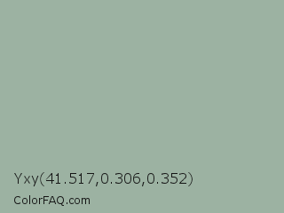 Yxy 41.517,0.306,0.352 Color is a light green color and the nearest color is Edward #a2aeab. Hex code #9cb2a2 and RGB value is rgb(156,178,162). In RGB color space, this color is composed of 61% red, 70% green, 64% blue, In CMYK color space, this color is composed of 12% cyan, 0% magenta, 9% yellow , 30% black , In HSL color space, this color has a hue angle of 136° , 13% saturation and 65% lightness.