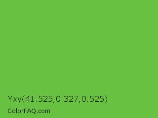 Yxy 41.525,0.327,0.525 Color is a normal green color and the nearest color is Green RYB #66b032. Hex code #69c141 and RGB value is rgb(105,193,65). In RGB color space, this color is composed of 41% red, 76% green, 25% blue, In CMYK color space, this color is composed of 46% cyan, 0% magenta, 66% yellow , 24% black , In HSL color space, this color has a hue angle of 101° , 51% saturation and 51% lightness.