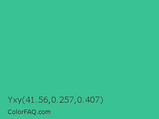 Yxy 41.56,0.257,0.407 Color is a normal green color and the nearest color is Mountain Meadow #30ba8f. Hex code #39c293 and RGB value is rgb(57,194,147). In RGB color space, this color is composed of 22% red, 76% green, 58% blue, In CMYK color space, this color is composed of 71% cyan, 0% magenta, 24% yellow , 24% black , In HSL color space, this color has a hue angle of 159° , 55% saturation and 49% lightness.