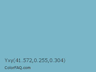 Yxy 41.572,0.255,0.304 Color is a light cyan color and the nearest color is Glacier #80b3c4. Hex code #79b6c7 and RGB value is rgb(121,182,199). In RGB color space, this color is composed of 47% red, 71% green, 78% blue, In CMYK color space, this color is composed of 39% cyan, 9% magenta, 0% yellow , 22% black , In HSL color space, this color has a hue angle of 193° , 41% saturation and 63% lightness.