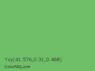Yxy 41.576,0.31,0.468 Color is a normal green color and the nearest color is Mantis #74c365. Hex code #6ebf68 and RGB value is rgb(110,191,104). In RGB color space, this color is composed of 43% red, 75% green, 41% blue, In CMYK color space, this color is composed of 42% cyan, 0% magenta, 46% yellow , 25% black , In HSL color space, this color has a hue angle of 116° , 40% saturation and 58% lightness.