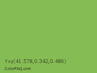 Yxy 41.578,0.342,0.486 Color is a normal green color and the nearest color is Dollar Bill #85bb65. Hex code #85bc53 and RGB value is rgb(133,188,83). In RGB color space, this color is composed of 52% red, 74% green, 33% blue, In CMYK color space, this color is composed of 29% cyan, 0% magenta, 56% yellow , 26% black , In HSL color space, this color has a hue angle of 91° , 44% saturation and 53% lightness.