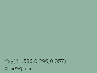 Yxy 41.586,0.296,0.357 Color is a light green color and the nearest color is Summer Green #96bbab. Hex code #8fb5a2 and RGB value is rgb(143,181,162). In RGB color space, this color is composed of 56% red, 71% green, 64% blue, In CMYK color space, this color is composed of 21% cyan, 0% magenta, 10% yellow , 29% black , In HSL color space, this color has a hue angle of 150° , 20% saturation and 64% lightness.