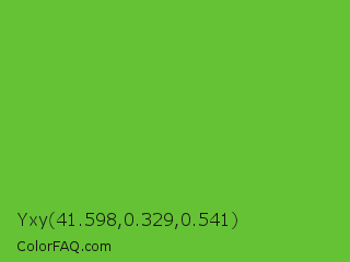 Yxy 41.598,0.329,0.541 Color is a normal green color and the nearest color is Green RYB #66b032. Hex code #65c234 and RGB value is rgb(101,194,52). In RGB color space, this color is composed of 40% red, 76% green, 20% blue, In CMYK color space, this color is composed of 48% cyan, 0% magenta, 73% yellow , 24% black , In HSL color space, this color has a hue angle of 99° , 58% saturation and 48% lightness.
