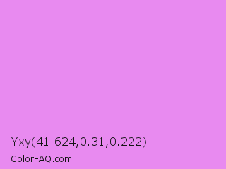 Yxy 41.624,0.31,0.222 Color is a light magenta color and the nearest color is Lavender Magenta #ee82ee. Hex code #e88af0 and RGB value is rgb(232,138,240). In RGB color space, this color is composed of 91% red, 54% green, 94% blue, In CMYK color space, this color is composed of 3% cyan, 43% magenta, 0% yellow , 6% black , In HSL color space, this color has a hue angle of 295° , 77% saturation and 74% lightness.