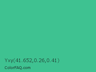 Yxy 41.652,0.26,0.41 Color is a normal green color and the nearest color is Ocean Green #48bf91. Hex code #3ec291 and RGB value is rgb(62,194,145). In RGB color space, this color is composed of 24% red, 76% green, 57% blue, In CMYK color space, this color is composed of 68% cyan, 0% magenta, 25% yellow , 24% black , In HSL color space, this color has a hue angle of 158° , 52% saturation and 50% lightness.