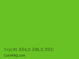 Yxy 41.654,0.336,0.553 Color is a normal green color and the nearest color is Lima #76bd17. Hex code #68c224 and RGB value is rgb(104,194,36). In RGB color space, this color is composed of 41% red, 76% green, 14% blue, In CMYK color space, this color is composed of 46% cyan, 0% magenta, 81% yellow , 24% black , In HSL color space, this color has a hue angle of 94° , 69% saturation and 45% lightness.