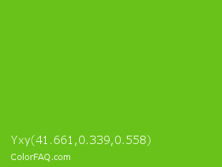 Yxy 41.661,0.339,0.558 Color is a normal green color and the nearest color is Lima #76bd17. Hex code #69c21a and RGB value is rgb(105,194,26). In RGB color space, this color is composed of 41% red, 76% green, 10% blue, In CMYK color space, this color is composed of 46% cyan, 0% magenta, 87% yellow , 24% black , In HSL color space, this color has a hue angle of 92° , 76% saturation and 43% lightness.
