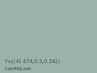Yxy 41.674,0.3,0.342 Color is a light green color and the nearest color is Edward #a2aeab. Hex code #9bb2a9 and RGB value is rgb(155,178,169). In RGB color space, this color is composed of 61% red, 70% green, 66% blue, In CMYK color space, this color is composed of 13% cyan, 0% magenta, 5% yellow , 30% black , In HSL color space, this color has a hue angle of 157° , 13% saturation and 65% lightness.