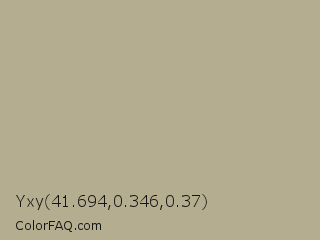 Yxy 41.694,0.346,0.37 Color is a light yellow color and the nearest color is Taupe Gray #b3af95. Hex code #b5ad8f and RGB value is rgb(181,173,143). In RGB color space, this color is composed of 71% red, 68% green, 56% blue, In CMYK color space, this color is composed of 0% cyan, 4% magenta, 21% yellow , 29% black , In HSL color space, this color has a hue angle of 47° , 20% saturation and 64% lightness.