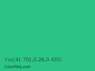 Yxy 41.701,0.26,0.433 Color is a normal green color and the nearest color is Mountain Meadow #30ba8f. Hex code #2ac487 and RGB value is rgb(42,196,135). In RGB color space, this color is composed of 16% red, 77% green, 53% blue, In CMYK color space, this color is composed of 79% cyan, 0% magenta, 31% yellow , 23% black , In HSL color space, this color has a hue angle of 156° , 65% saturation and 47% lightness.