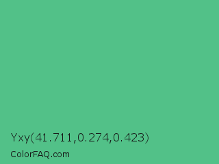 Yxy 41.711,0.274,0.423 Color is a normal green color and the nearest color is Ocean Green #48bf91. Hex code #52c188 and RGB value is rgb(82,193,136). In RGB color space, this color is composed of 32% red, 76% green, 53% blue, In CMYK color space, this color is composed of 58% cyan, 0% magenta, 30% yellow , 24% black , In HSL color space, this color has a hue angle of 149° , 47% saturation and 54% lightness.