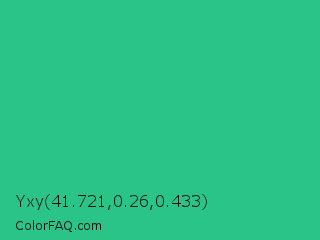 Yxy 41.721,0.26,0.433 Color is a normal green color and the nearest color is Mountain Meadow #30ba8f. Hex code #2ac487 and RGB value is rgb(42,196,135). In RGB color space, this color is composed of 16% red, 77% green, 53% blue, In CMYK color space, this color is composed of 79% cyan, 0% magenta, 31% yellow , 23% black , In HSL color space, this color has a hue angle of 156° , 65% saturation and 47% lightness.
