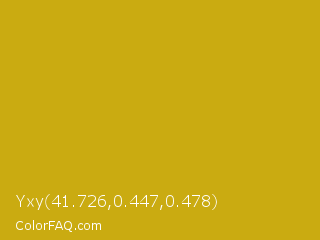 Yxy 41.726,0.447,0.478 Color is a normal yellow color and the nearest color is Lemon Curry #cca01d. Hex code #caab11 and RGB value is rgb(202,171,17). In RGB color space, this color is composed of 79% red, 67% green, 7% blue, In CMYK color space, this color is composed of 0% cyan, 15% magenta, 92% yellow , 21% black , In HSL color space, this color has a hue angle of 50° , 84% saturation and 43% lightness.