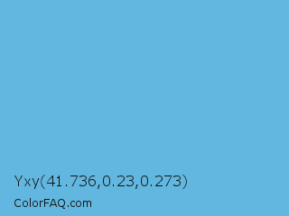 Yxy 41.736,0.23,0.273 Color is a light blue color and the nearest color is Blue Jeans #5dadec. Hex code #61b7df and RGB value is rgb(97,183,223). In RGB color space, this color is composed of 38% red, 72% green, 87% blue, In CMYK color space, this color is composed of 57% cyan, 18% magenta, 0% yellow , 13% black , In HSL color space, this color has a hue angle of 199° , 66% saturation and 63% lightness.