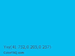 Yxy 41.752,0.205,0.257 Color is a normal cyan color and the nearest color is Cyan Process #00b7eb. Hex code #06bbee and RGB value is rgb(6,187,238). In RGB color space, this color is composed of 2% red, 73% green, 93% blue, In CMYK color space, this color is composed of 97% cyan, 21% magenta, 0% yellow , 7% black , In HSL color space, this color has a hue angle of 193° , 95% saturation and 48% lightness.