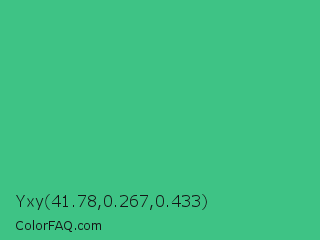 Yxy 41.78,0.267,0.433 Color is a normal green color and the nearest color is Mint #3eb489. Hex code #3ec385 and RGB value is rgb(62,195,133). In RGB color space, this color is composed of 24% red, 76% green, 52% blue, In CMYK color space, this color is composed of 68% cyan, 0% magenta, 32% yellow , 24% black , In HSL color space, this color has a hue angle of 152° , 53% saturation and 50% lightness.