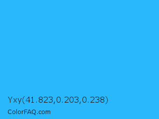 Yxy 41.823,0.203,0.238 Color is a normal blue color and the nearest color is Spiro Disco Ball #0fc0fc. Hex code #2ab8fc and RGB value is rgb(42,184,252). In RGB color space, this color is composed of 16% red, 72% green, 99% blue, In CMYK color space, this color is composed of 83% cyan, 27% magenta, 0% yellow , 1% black , In HSL color space, this color has a hue angle of 199° , 97% saturation and 58% lightness.