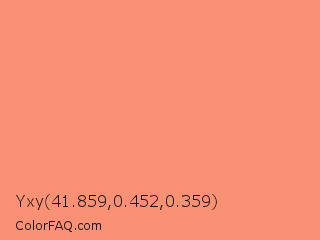 Yxy 41.859,0.452,0.359 Color is a light red color and the nearest color is Salmon #ff8c69. Hex code #fa9175 and RGB value is rgb(250,145,117). In RGB color space, this color is composed of 98% red, 57% green, 46% blue, In CMYK color space, this color is composed of 0% cyan, 42% magenta, 53% yellow , 2% black , In HSL color space, this color has a hue angle of 13° , 93% saturation and 72% lightness.