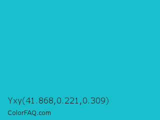 Yxy 41.868,0.221,0.309 Color is a normal cyan color and the nearest color is Java #1fc2c2. Hex code #18bfcc and RGB value is rgb(24,191,204). In RGB color space, this color is composed of 9% red, 75% green, 80% blue, In CMYK color space, this color is composed of 88% cyan, 6% magenta, 0% yellow , 20% black , In HSL color space, this color has a hue angle of 184° , 79% saturation and 45% lightness.