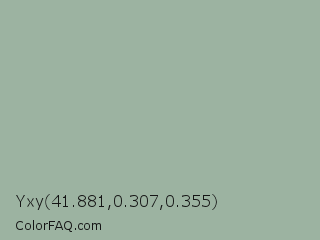 Yxy 41.881,0.307,0.355 Color is a light green color and the nearest color is Pewter #96a8a1. Hex code #9cb3a1 and RGB value is rgb(156,179,161). In RGB color space, this color is composed of 61% red, 70% green, 63% blue, In CMYK color space, this color is composed of 13% cyan, 0% magenta, 10% yellow , 30% black , In HSL color space, this color has a hue angle of 133° , 13% saturation and 66% lightness.
