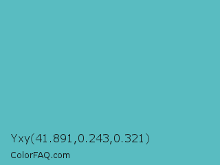 Yxy 41.891,0.243,0.321 Color is a normal cyan color and the nearest color is Fountain Blue #56b4be. Hex code #59bcc1 and RGB value is rgb(89,188,193). In RGB color space, this color is composed of 35% red, 74% green, 76% blue, In CMYK color space, this color is composed of 54% cyan, 3% magenta, 0% yellow , 24% black , In HSL color space, this color has a hue angle of 183° , 46% saturation and 55% lightness.