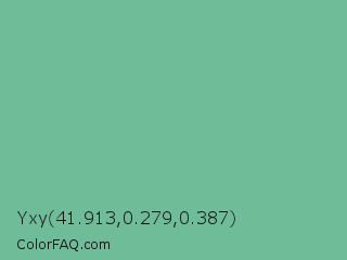 Yxy 41.913,0.279,0.387 Color is a normal green color and the nearest color is Silver Tree #66b58f. Hex code #6ebd98 and RGB value is rgb(110,189,152). In RGB color space, this color is composed of 43% red, 74% green, 60% blue, In CMYK color space, this color is composed of 42% cyan, 0% magenta, 20% yellow , 26% black , In HSL color space, this color has a hue angle of 152° , 37% saturation and 59% lightness.